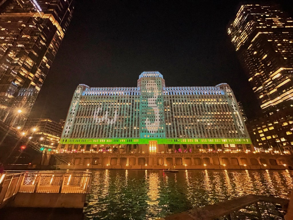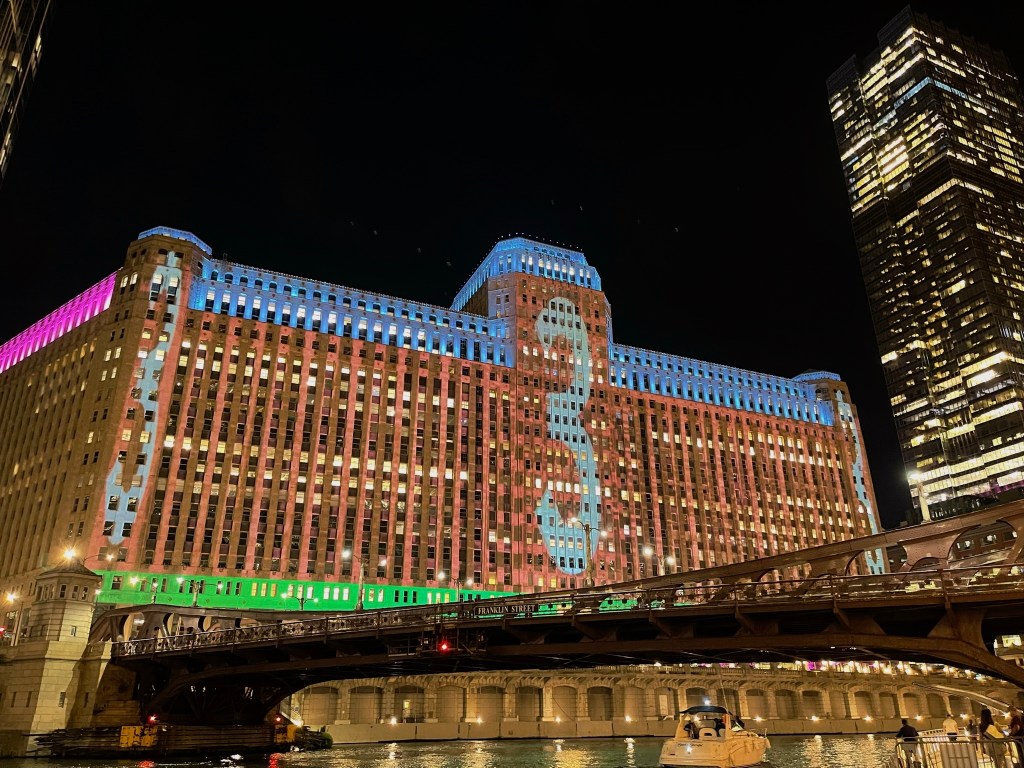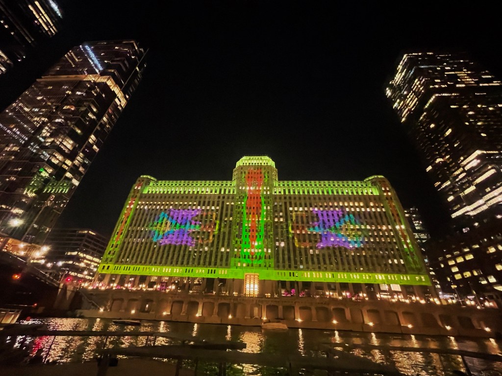 The show is projected onto the south side of theMART, a 25 stories tall building sitting next to the Chicago River. The best viewpoints are from the Chicago River Walk between Franklin and Wells Street. Alternatively, you can also position yourself on the street level next to Wacker Drive between Franklin and Wells Street.