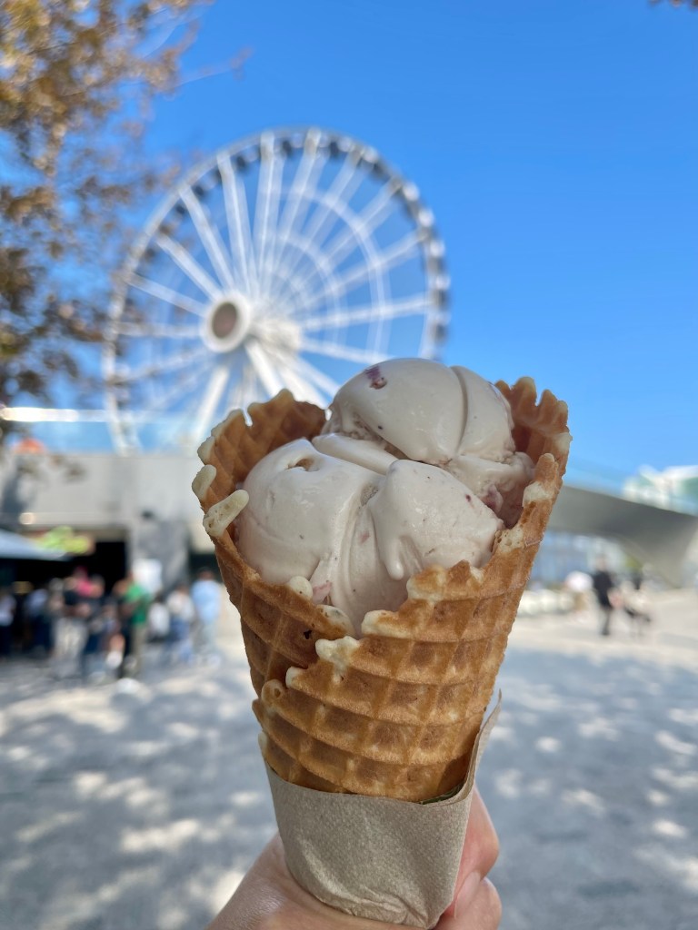 All I can think of even before I had the salad was ice cream. I saw a Ben & Jerry’s in the pavilion so that’s what I had for dessert. Since I only have half salad, I still had space for a dessert .. it’s all about planning 🙂 I got a waffle cone with 1 scoop of Strawberry ice cream.