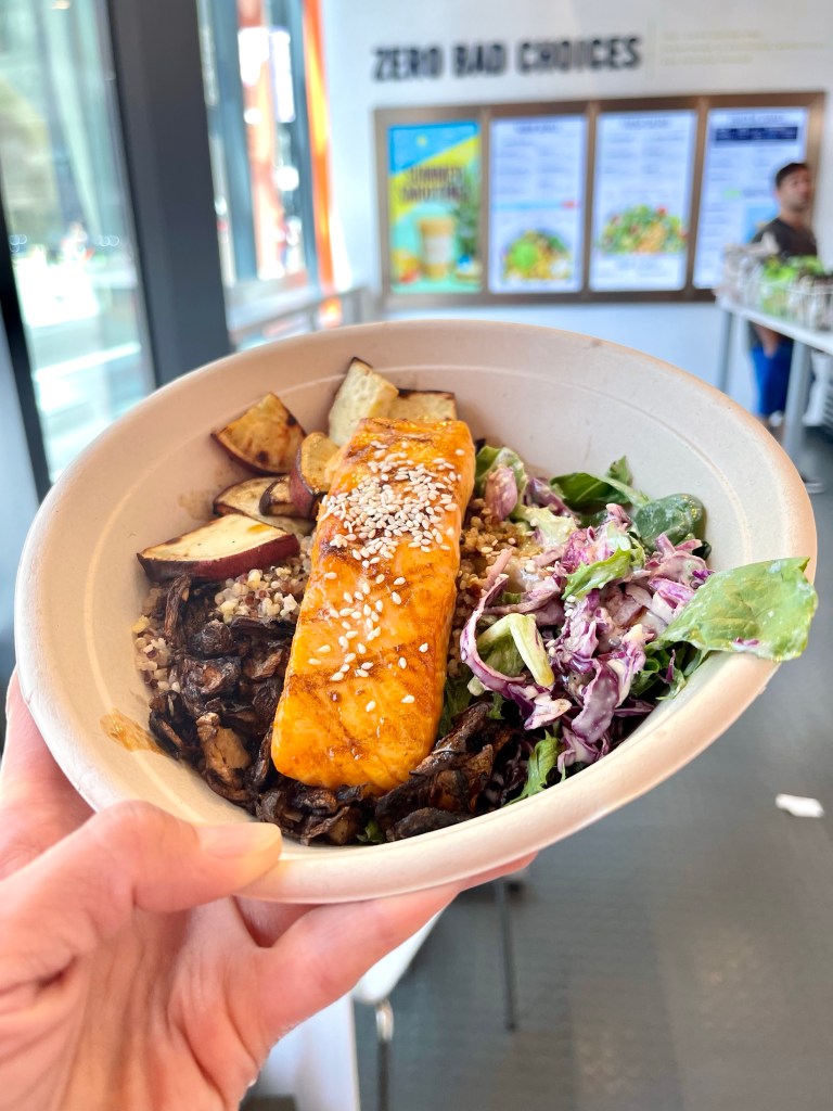 Salmon, roasted Japanese sweet potato, roasted mushroom, red cabbage, Japanese BBQ sauce, organic quinoa, mixed greens, toasted sesame seeds and roasted sesame dressing