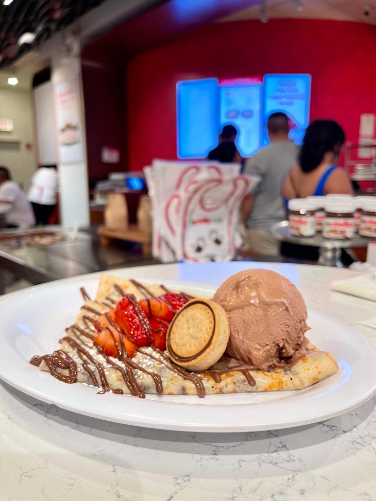 Crepe with Strawberry & Gelato + Biscuit: 15.57 USD