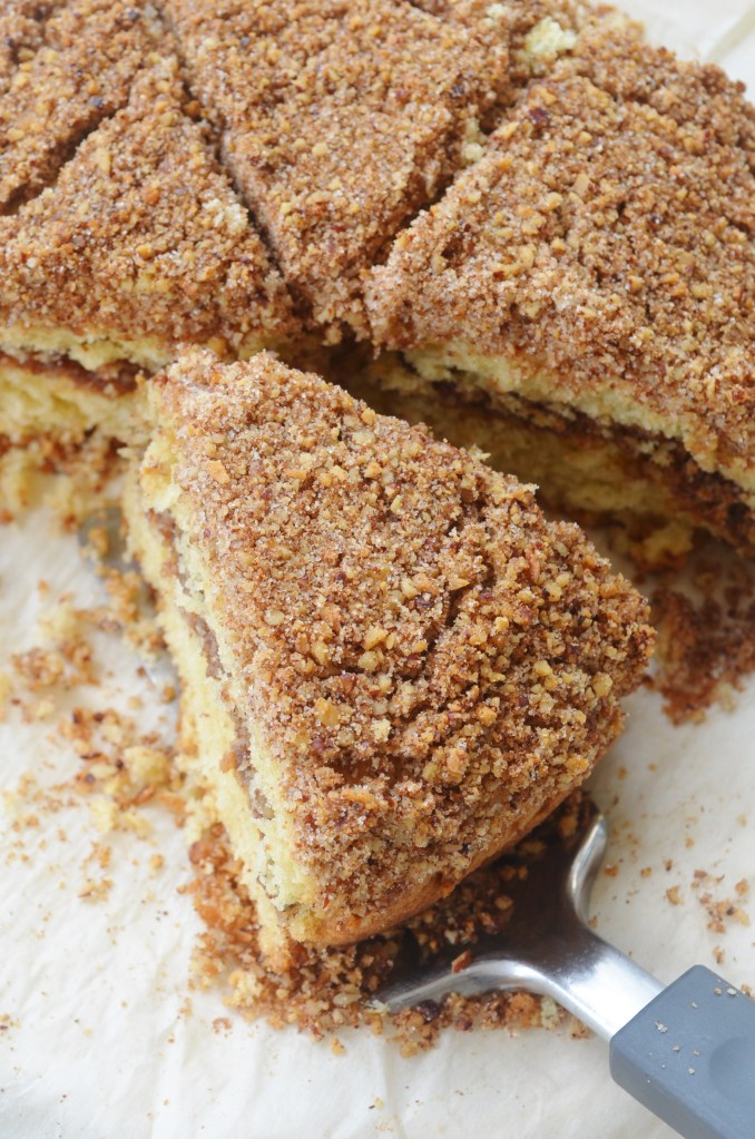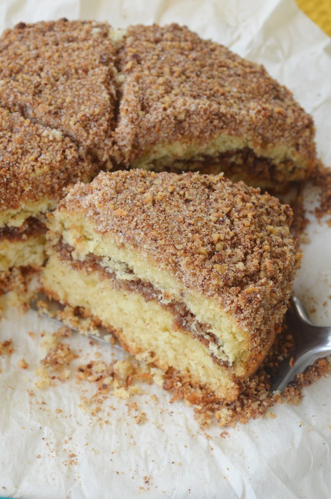 Baked in an 8-inch round pan, this cake is moist and tender, like a delightful cross between a yellow cake and a butter cake. Topped with a pecan crumb topping, it’s sure to impress.
