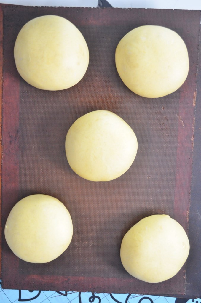 For the buns, a classic bread dough recipe will do. A little sugar, salt, yeast, flour, egg butter and water work together to create a soft, pillowy texture. This is a yeast bread and it will require 2 rest perios of at least 60 minutes each.