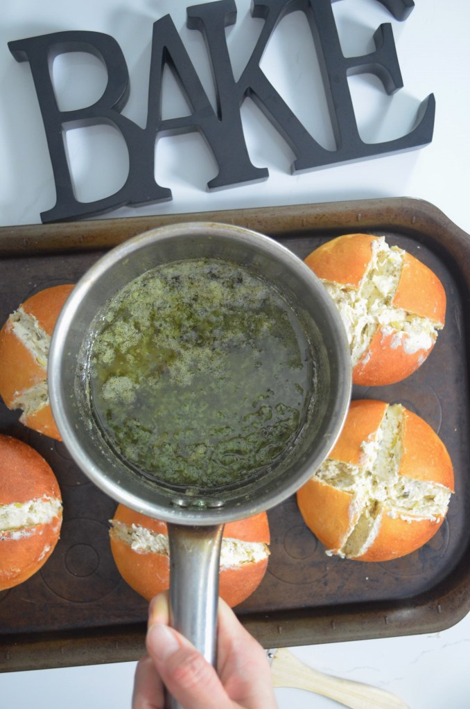 - Dip in Garlic Butter: Dip or brush each buns in garlic butter mixture. Hold the bottom of the buns and dip to cover the bread with butter. Alternatively, you can also spoon or brush the garlic butter to coat the bread.