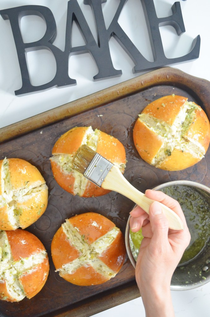 The garlic butter will help infuse garlic flavor to the buns, plus it will give nice browning. Before baking, dip each bun into a rich garlic butter mixture. This creates that golden, buttery crust that makes your buns irresistible. You can also brush the buns but dipping will give you the fuller coverage. So dip it!