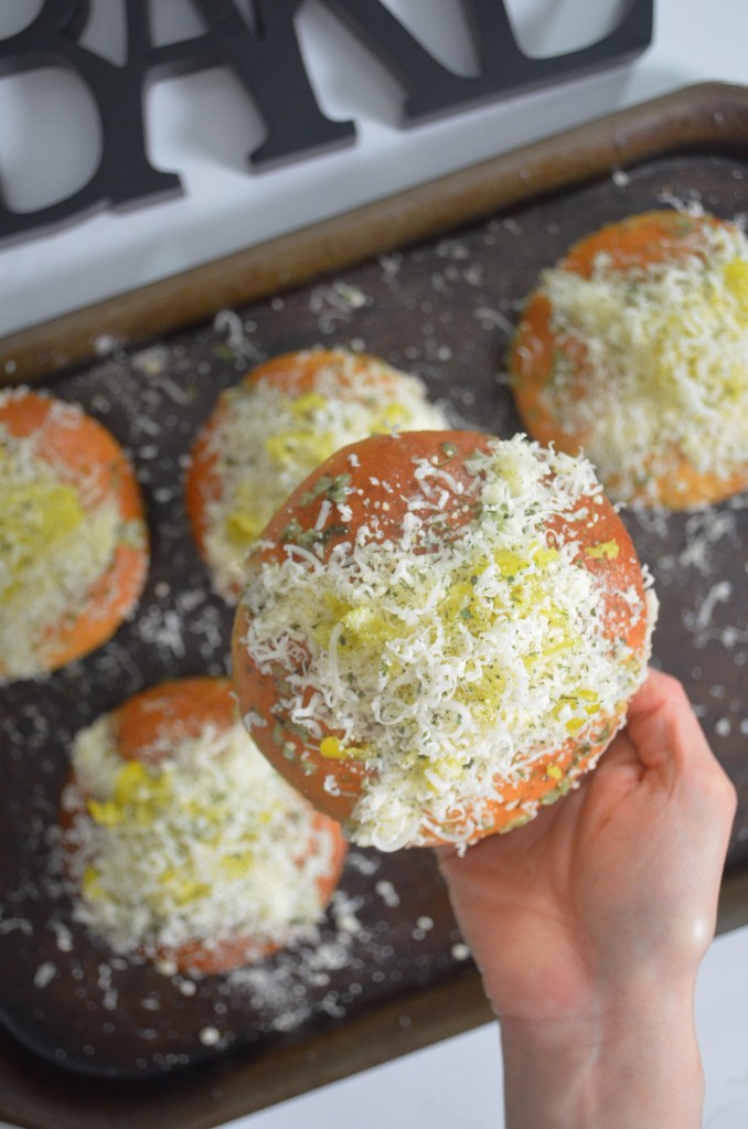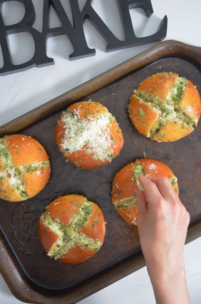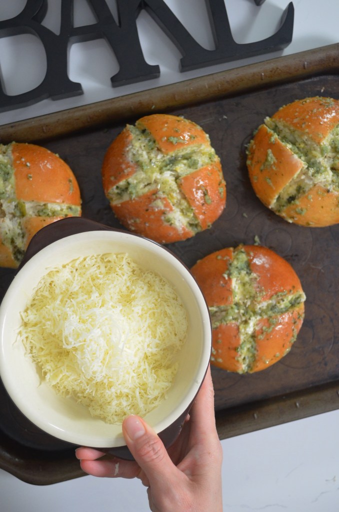 This is one twist that I added in my version. This was the same technique that I used when I made my Korean Garlic Bread. Adding more cheese on top before baking really takes this bread to a higher level. So top each bun with grated cheddar and Parmesan cheese, followed by sliced pickled jalapeños for a tangy kick. Bake until golden brown and bubbling!