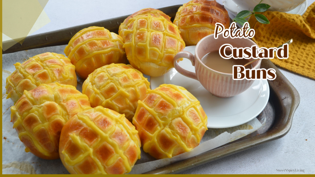 Soft, fluffy, and slightly sweet—these Potato Custard Bread Buns are a delightful homemade treat with a twist! Unlike traditional bread rolls, these buns incorporate boiled potatoes into the dough, creating an irresistibly soft texture. To take them up a notch, a custard paste is piped on top in a criss-cross pattern (making them look like pineapple!), giving them a beautifully golden and decorative finish.