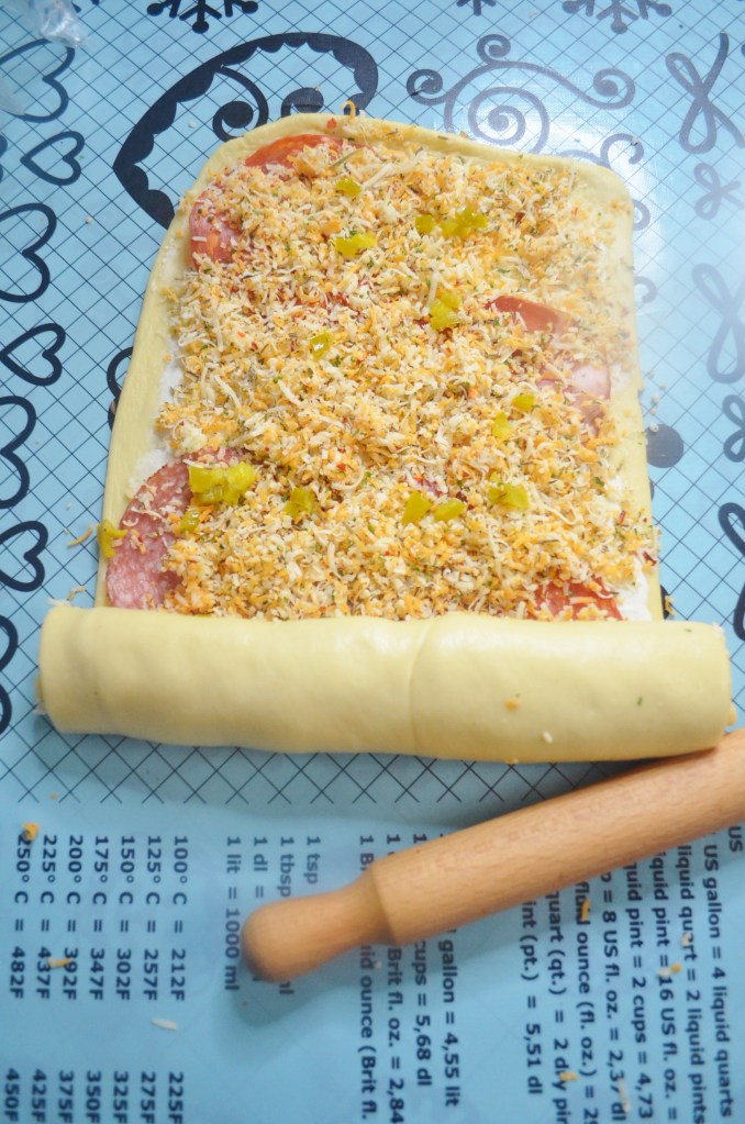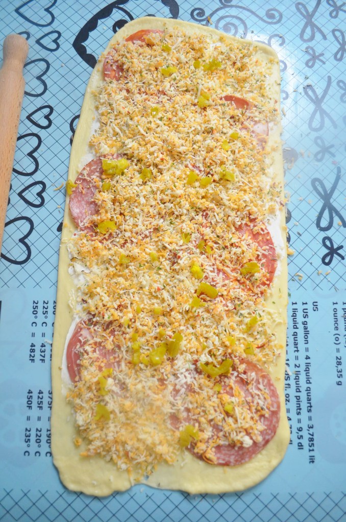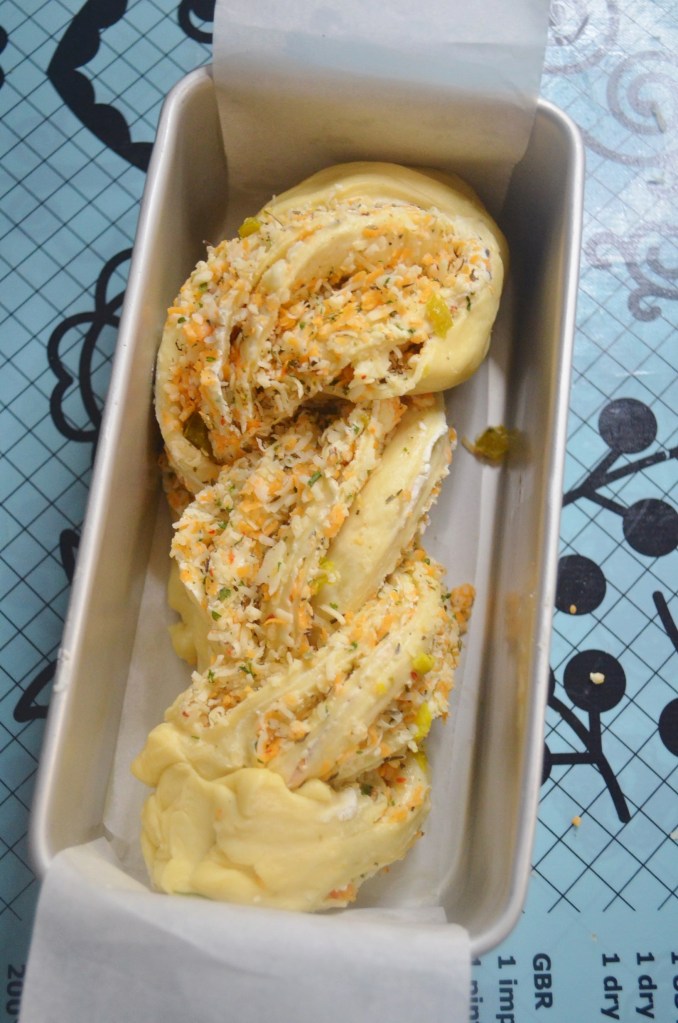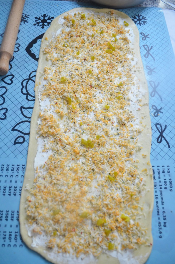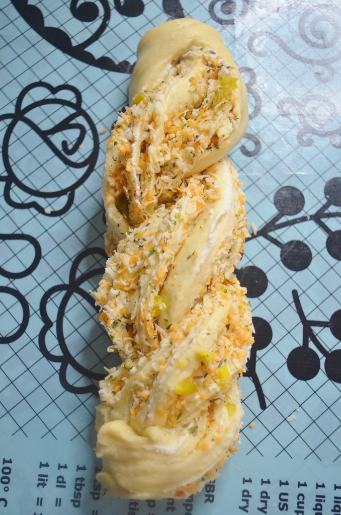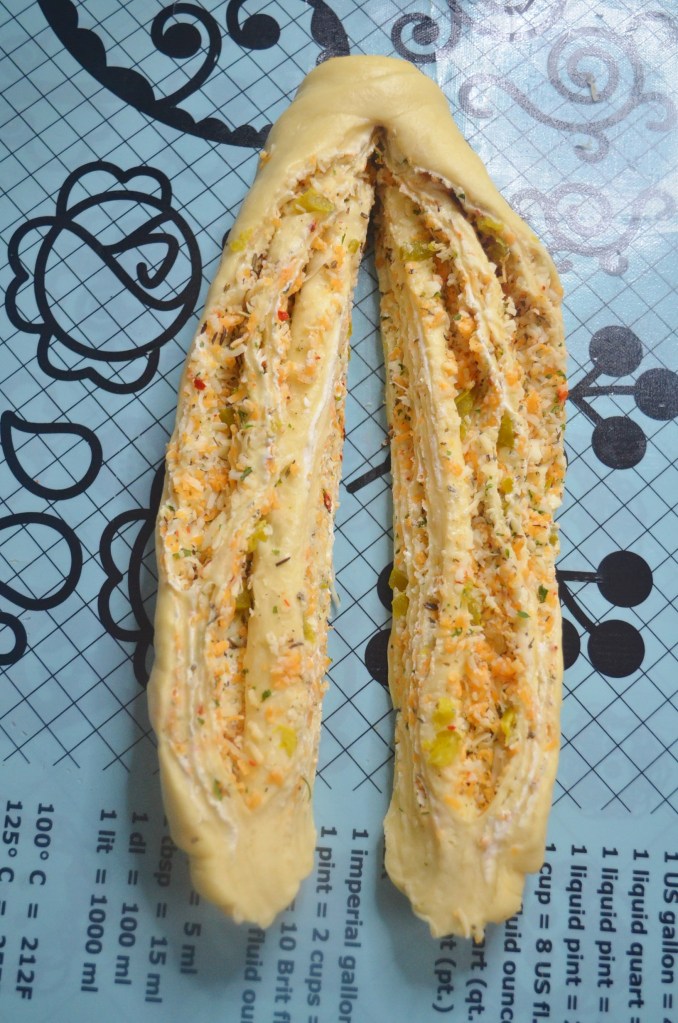 This variation only uses the Jalapeno and Cheese filling, intended for someone who doesn’t like cold cuts. Most of the steps are similar but instead of cutting the dough into 3, we are only doing to. This one uses a twised style. Same 7-inch loaf pan was used for thisone.