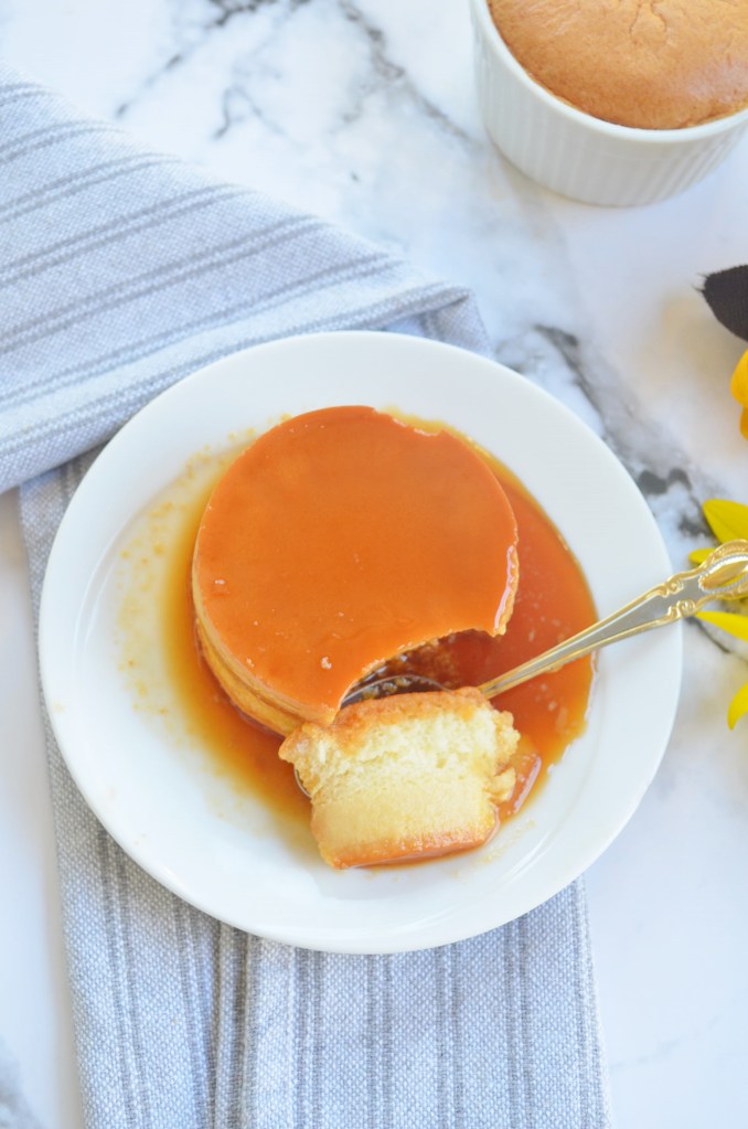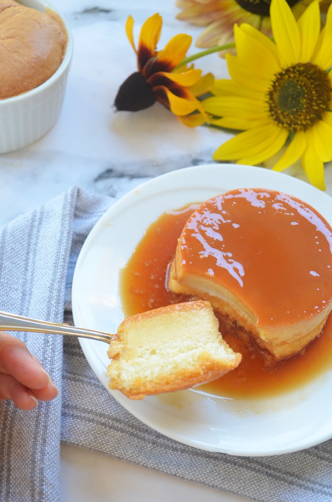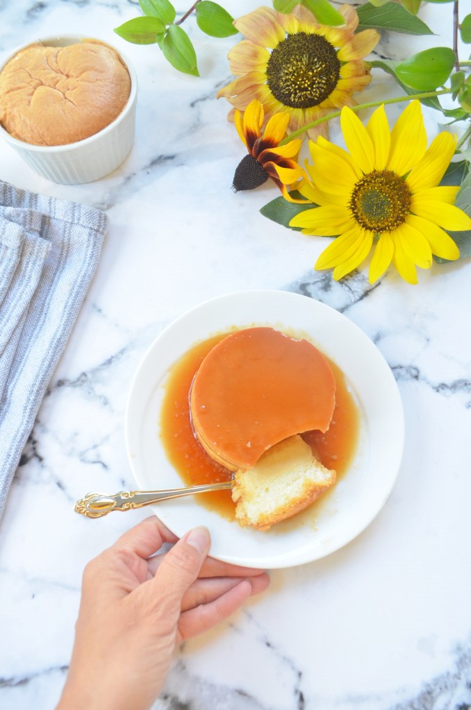 The flan layer starts with homemade caramel—just sugar melted until golden and poured into each ramekin. The custard itself is a simple yet luxurious blend of eggs, milk, and sugar, baked until it’s firm yet velvety soft. The secret to that perfect texture? A low and slow bake in a water bath! It takes a bit more time, but it is definitel worth the wait so be patient. You will be rewarded with a smooth and creamy flan and a soft airy chiffon cake layer.